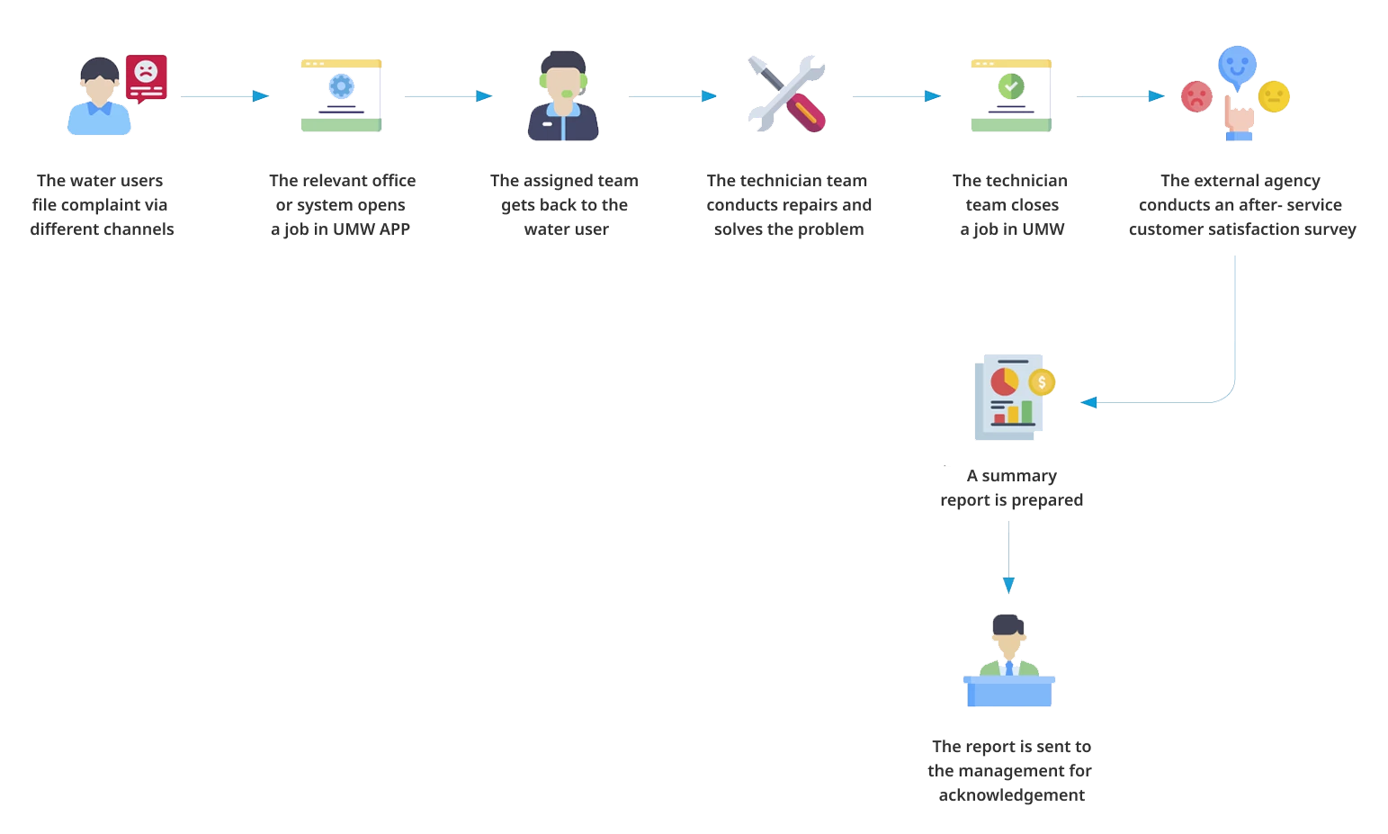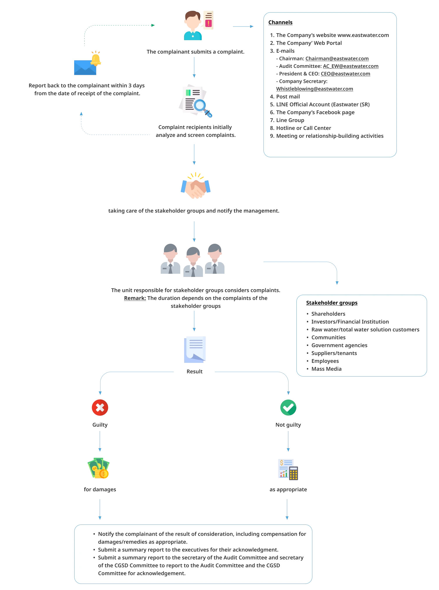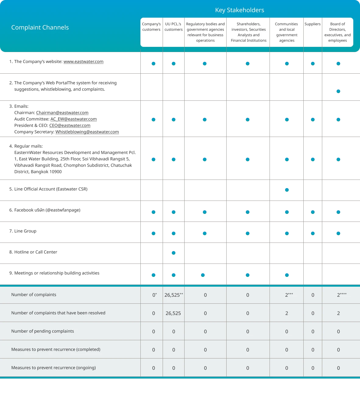 East Water values the feedback of stakeholders throughout its supply chain. It has put in place complaint handling process for its stakeholder by establishing a unit responsible for handling various complaints received from various channels as well as to have systematic complaint handling mechanism to reduce business risk. This is to demonstrate the Company’s commitment to corporate social responsibility, transparent business operations, and promotion of good relationships with its stakeholders. The Company also applied the lesson learned to drive business operations towards sustainable organizational development.