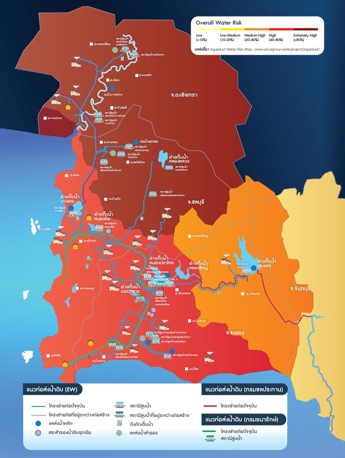 The Company’s water pipeline network covers 3 provinces in the eastern region, namely Rayong, Chonburi, and Chachoengsao. The total length of the pipeline is 553 kilometers. They are connected to each other and connect the main water sources and water reserves of both the government sector and the Company in the form of a water grid to be able to manage water source to be suitable for the water demand in each area and be in line with the amount of water supply source in each period. In order to maximize the effectiveness of water management, including the consideration of water reserves to create stability of water resources and develop the water grid to cope with drought risks in the eastern region, the Company has an action plan to stabilize the water grid system, consisting of 3 parts: