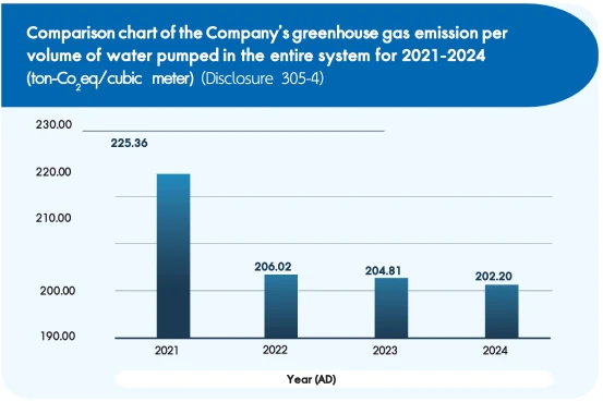 Remark: Calculated based on energy consumption at pumping stations compared to the total pumped water volume of 304,973,676.00 cubic meters. Volume of GHG emissions in the water pumping system per total water pumped average 3 years (2022-2024) equals 204.34 tonCO2eq/million cubic meters.