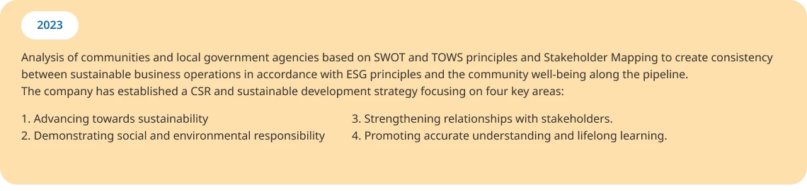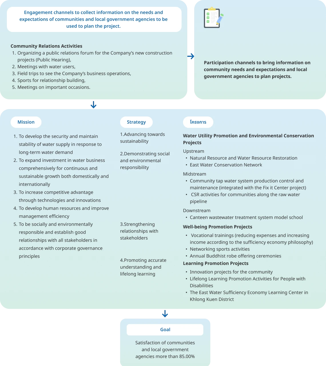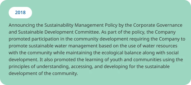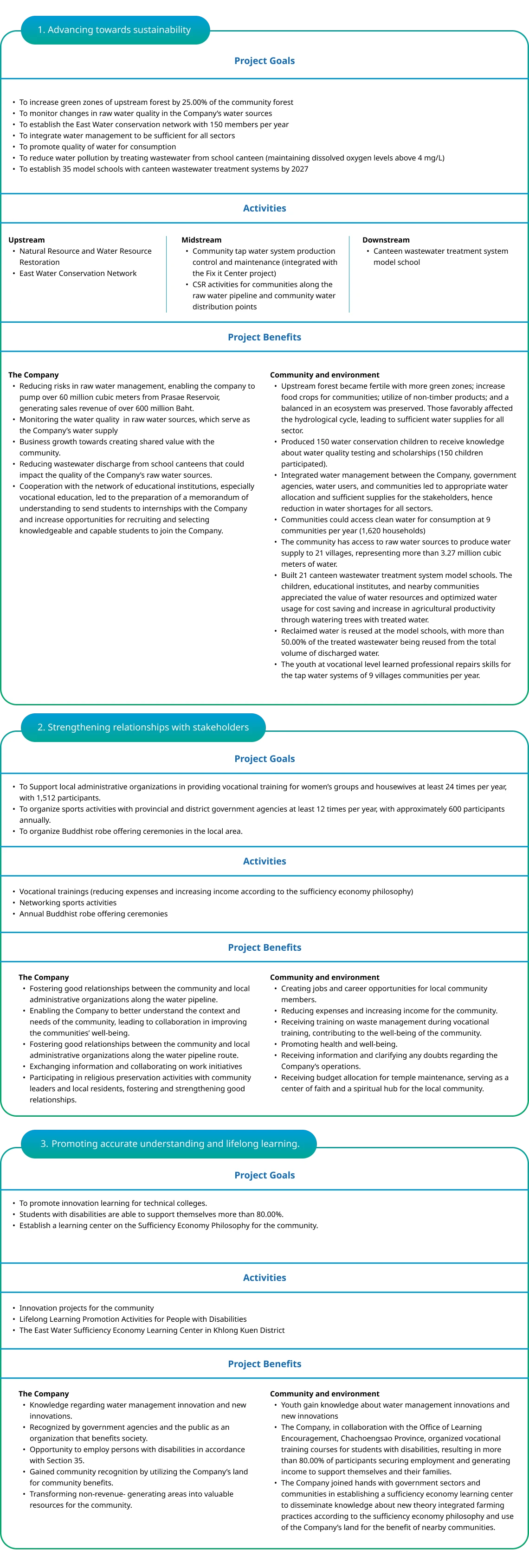 The Company’s sustainability efforts aim to enhance the well-being of communities along the pipeline routes and around the Company’s water sources, including access to water utility, education and lifelong learning, health and well-being, employment, and environmental preservation, while also maintaining local traditions and cultural heritage. These initiatives are carried out through various activities in collaboration with local administrative organizations, community leaders, government agencies, and private sector entities. This approach aligns with the Company’s business strategy, which focuses on fostering economic growth in the Eastern region and other provinces where the company operates. These efforts are implemented through projects and activities that directly connect to the Company’s core mission, as outlined below.