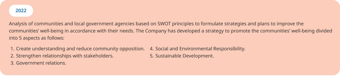 The Company has established sustainability goals through a 4-pronged strategic approach, incorporating a participatory process with stakeholders at all levels, including students, the public, community leaders, and local leaders. This participation spans from awareness and information-sharing to collaborative planning, project implementation, and evaluation between the Company and the community. The Company has determined the method of measuring the project results through a stakeholder survey.