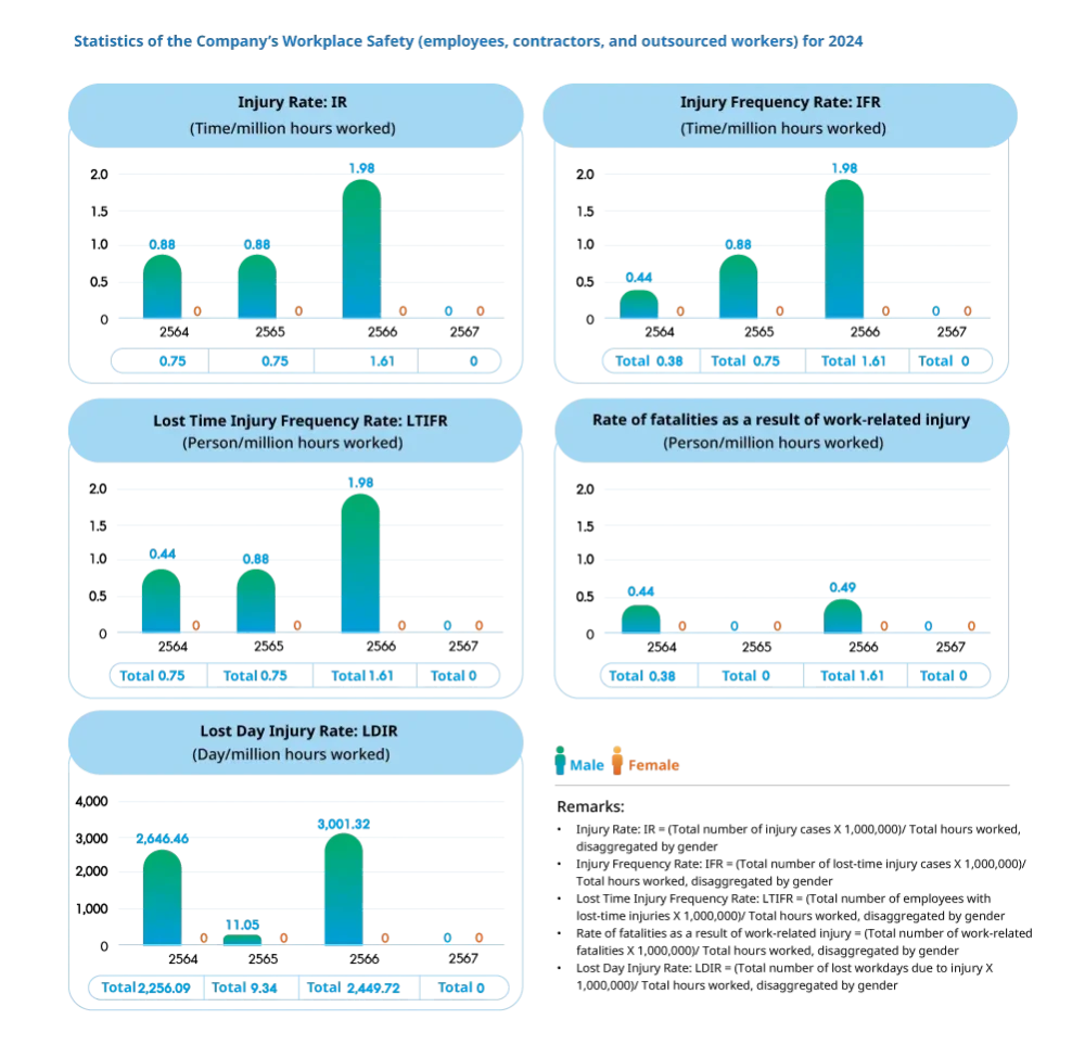 1.2 Contractors and Outsourced workers : The Company required that its contractors and outsourced workers have an annual health check to monitor chronic communicable diseases, diabetes, high blood pressure, abnormal blood lipid, that may affect cardiovascular disease, as we monitoring abnormalities from work such as vision loss, hearing loss from loud noise, etc. Especially working in hazardous areas, contractors and outsourced workers who enter the area must have health check-up results in accordance with law and strictly follow it. In 2024, contractors and outsourced workers of the Company did not find the incidence of occupational diseases