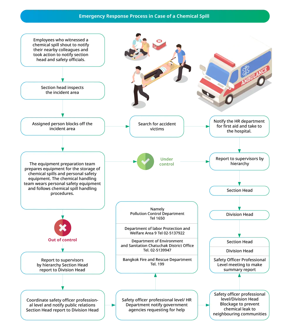 B.E. 2556 (2013). The Company has inspected storage area for leakage chemicals monthly. There is a report of a list of hazardous chemicals with details of the safety information of hazardous chemicals (Sor Or.1), a report of measurement and analysis of the concentration of hazardous chemicals in the atmosphere of the workplace and the hazardous chemicals storage area (Sor Or.3), and declaration form of producers, importers, exporters, or persons in possession of hazardous substances under he responsibility of the Department of Industrial Works (Wor Or. Or Kor 7) as required by law. (Disclosure 305-6)