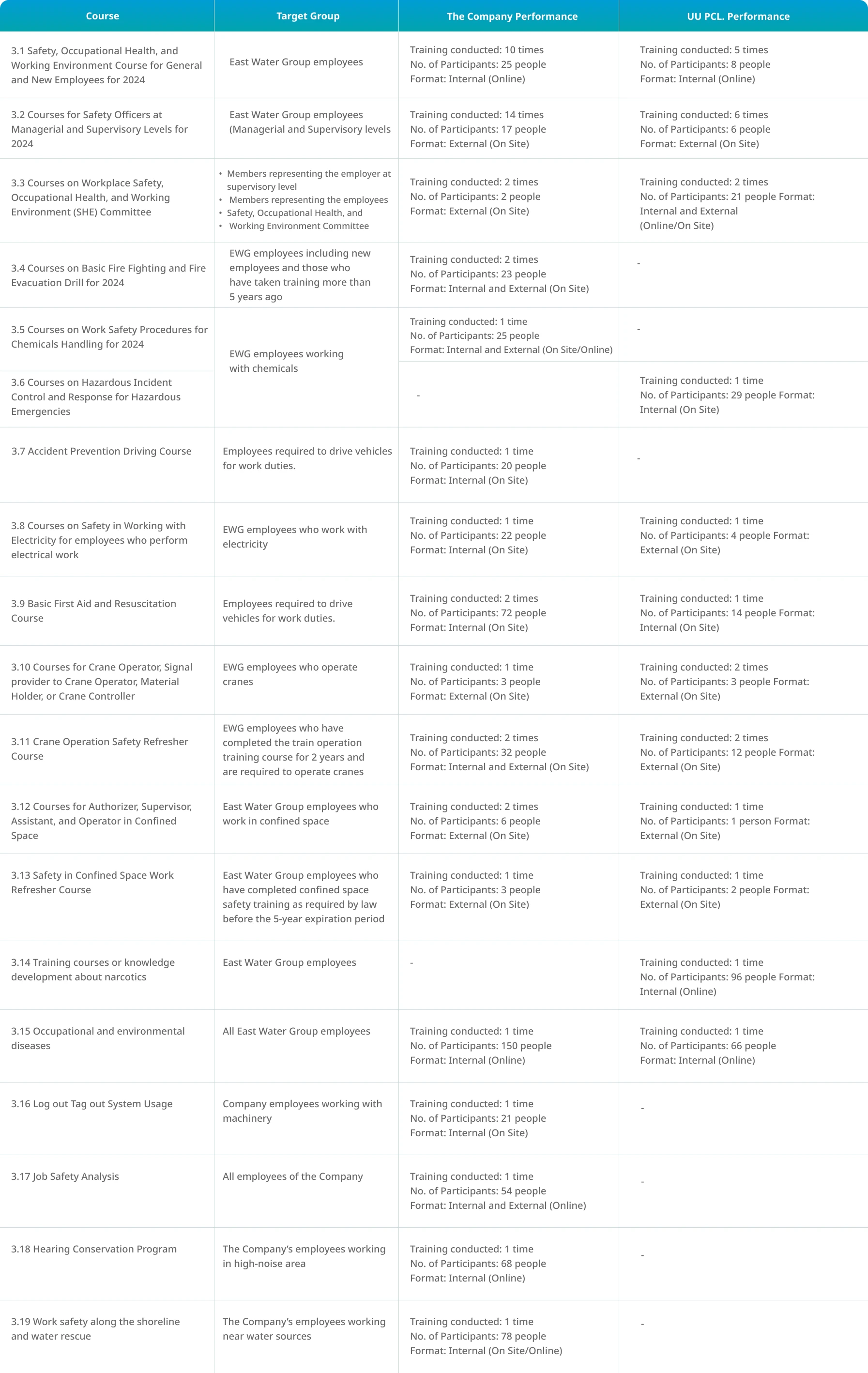 In 2024, the East Water Group had 3 Working Groups (Committee) on Safety, Occupational Health, and Working Environment i.e., Working Group of the Head Office, Working Group of the Operating Area, and Working Group of UU PCL., to thoroughly oversee the operations in the respective areas under responsibilities. They hold meeting every month and consist of members as follows: (Disclosure 403-4: 2018)