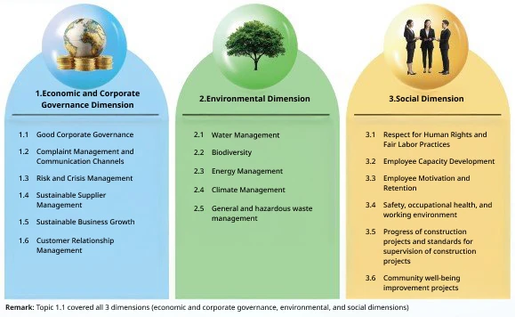 The material topics obtained from the analysis by the Sustainability Development Working Group of the East Water Group were proposed to the high-level executives for consideration and endorsement. Those topics were also endorsed by the Corporate Governance and Sustainability Development Committee to determine the content covering 3 dimensions namely economic and corporate governance, social, and environmental dimensions.