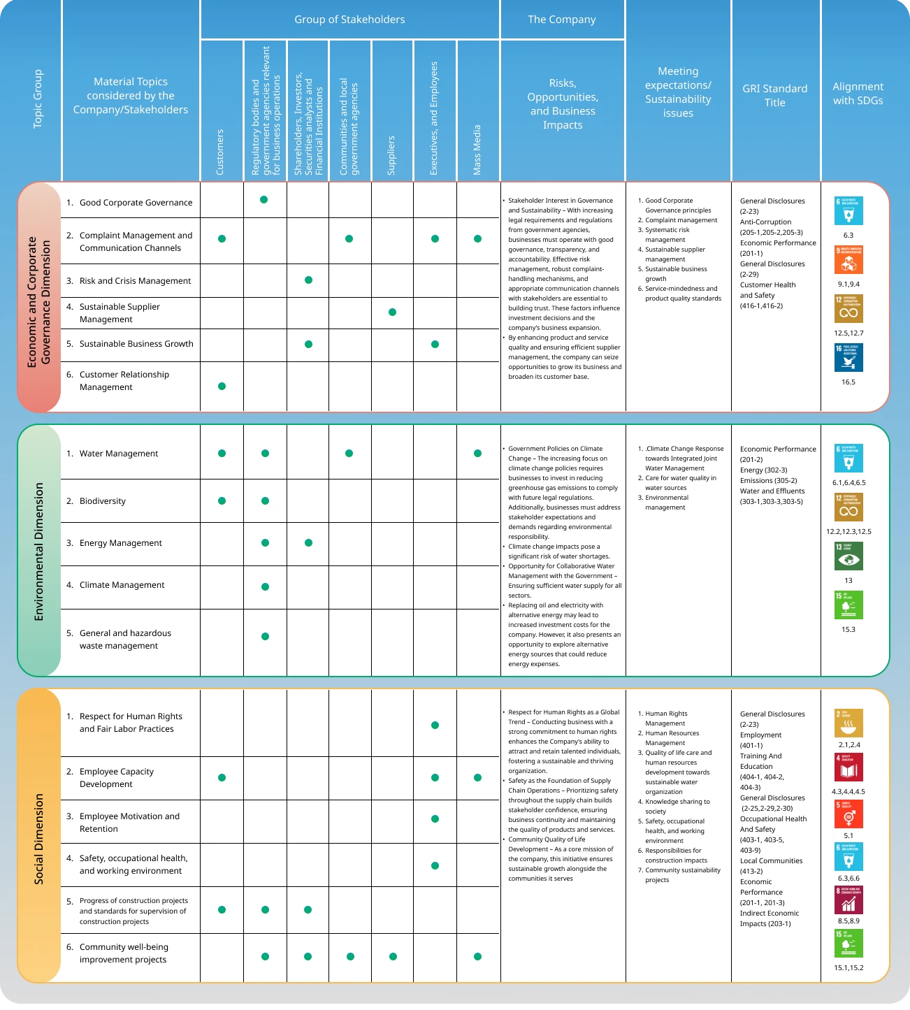 - Vertical axis: The scope of severity and negative impacts of sustainability topics on stakeholders by determining from the number of stakeholders group affected and the impact on economic and corporate governance dimension, environmental dimension, and social dimension