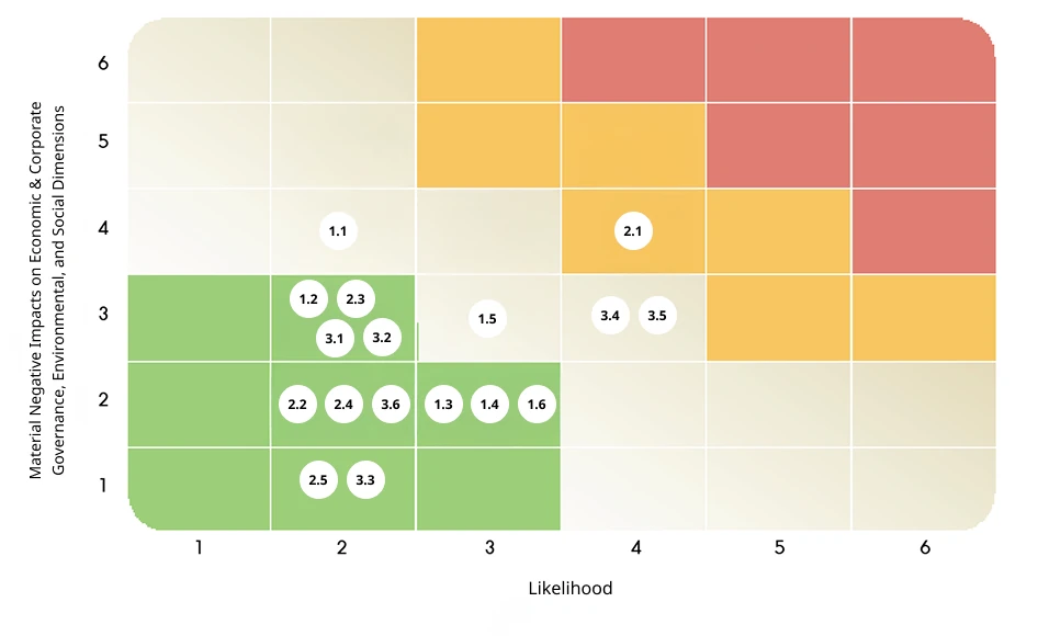 - Horizontal axis: Potential impacts from material sustainability topics to stakeholders by considering the likelihood of impactful events, including the Company’s control, prevention, monitoring and audit measures