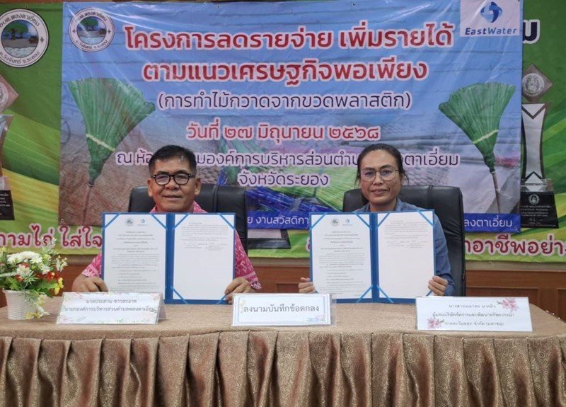 แผนกชุมชนสัมพันธ์และ CSR จัดกิจกรรมพบปะเครือข่ายชุมชน กลุ่มสตรีและผู้สูงอายุ ในพื้นที่องค์การบริหารส่วนตำบลพลงตาเอี่ยม อ.วังจันทร์ จ.ระยอง สอนทำไม้กวาด จากขวดพลาสติก เพื่อสร้างความผูกพันใกล้ชิดกับชุมชน เสริมสร้างรายได้ ลดรายจ่ายชุมชน ในพื้นที่ฯพร้อมสอดแทรกความเข้าใจที่ถูกต้องเกี่ยวกับบทบาทและภารกิจของอีสท์วอเตอร์