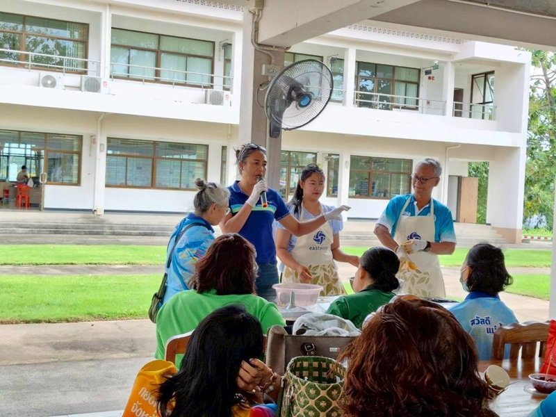 แผนกชุมชนสัมพันธ์และ CSR จัดกิจกรรมพบปะเครือข่ายชุมชน กลุ่มสตรีและผู้สูงอายุในพื้นที่ ต.แม่น้ำคู้ อ.ปลวกแดง จ.ระยอง สอนทำไส้อั่ว เพื่อสร้างความผูกพันใกล้ชิดกับชุมชนเสริมสร้างรายได้ ลดรายจ่ายชุมชนในพื้นที่ฯ พร้อมสอดแทรกความเข้าใจที่ถูกต้อง เกี่ยวกับบทบาทและภารกิจของอีสท์วอเตอร์