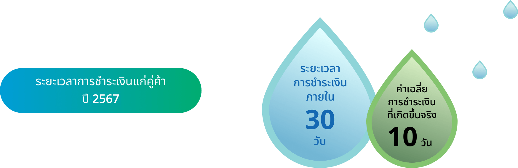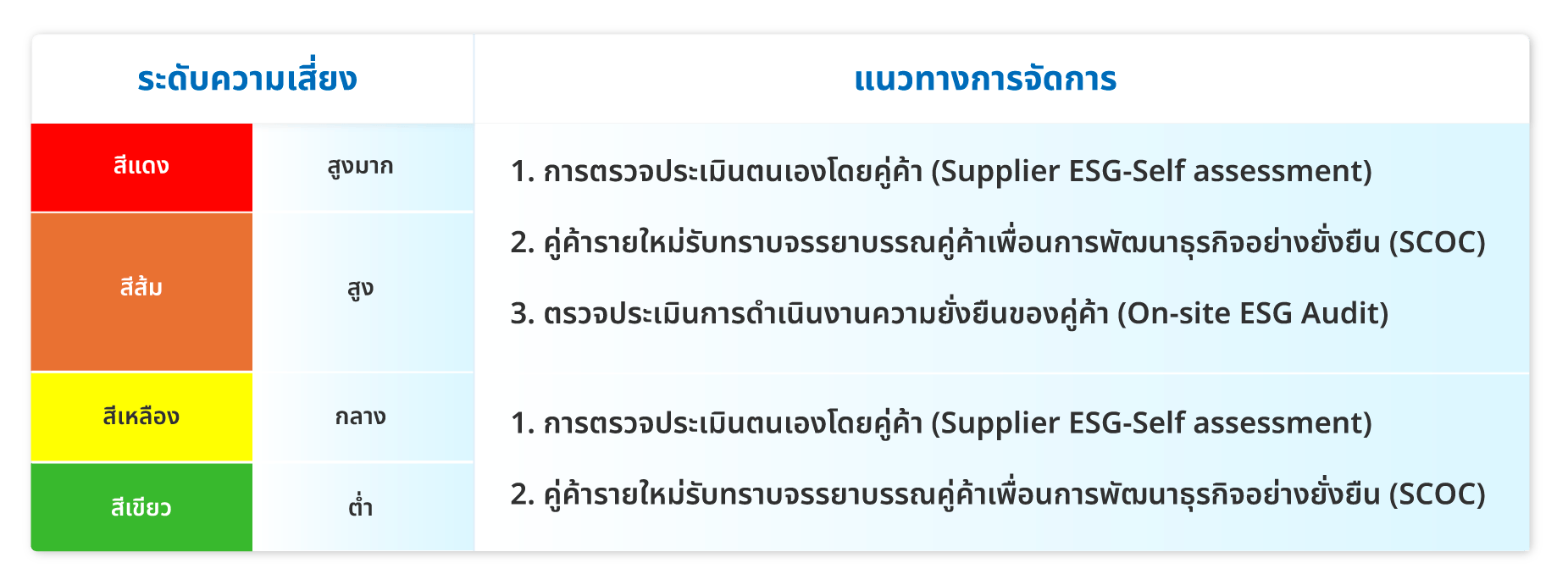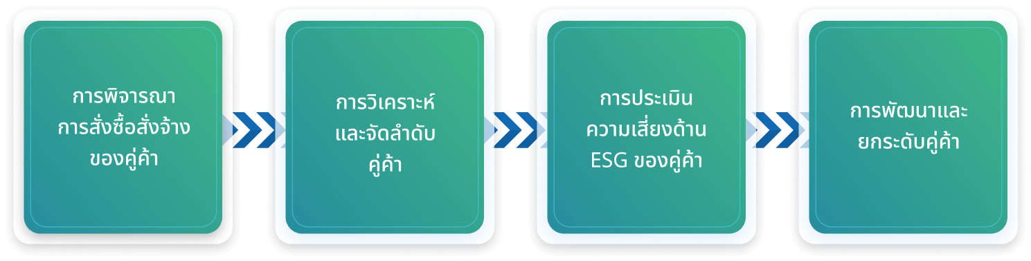 บริษัทมีความมุ่งมั่นดำเนินธุรกิจกับคู่ค้าตามจรรยาบรรณคู่ค้าเพื่อการพัฒนาธุรกิจอย่างยั่งยืน (Supplier Code of Conduct Sustainable Business Development : SCOC) ที่ครอบคลุมประเด็นทางด้านสิ่งแวดล้อม สังคม และบรรษัทภิบาล กระบวนการประเมินความเสี่ยงด้าน ESG จะเริ่มการจำแนกคู่ค้าตามประเภทของการดำเนินงานหลักของบริษัท เป็นการพิจารณาถึงเหตุการณ์ความเสี่ยงซึ่งอาจจะเกิดขึ้นและมีผลกระทบต่อกิจกรรมทางธุรกิจ จาก 2 มุมมองได้แก่ โอกาสที่จะเกิด (LIKELIHOOD) และผลกระทบ (IMPACT) โดยให้พิจารณาผสมผสานระหว่างวิธีการประเมินเชิงคุณภาพ (QUALITATIVE) และวิธีการประเมินเชิงปริมาณ (QUANTITATIVE) เพื่อระบุกลุ่มคู่ค้าที่มีความเสี่ยงสูง และเตรียมแนวทางการจัดการเพื่อลดความเสี่ยง และลดผลกระทบในแต่ละกลุ่มคู่ค้าลง