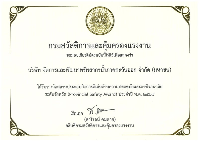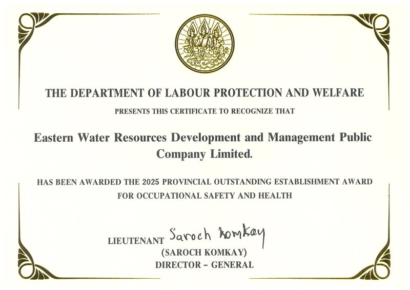บริษัท จัดการและพัฒนาทรัพยากรน้ำภาคตะวันออก จำกัด (มหาชน) หรือ อีสท์ วอเตอร์ ตอกย้ำความมุ่งมั่นในการบริหารจัดการด้านความปลอดภัย อาชีวอนามัย และสภาพแวดล้อมในการทำงานอย่างยั่งยืน โดยได้รับมอบประกาศเกียรติคุณรางวัลสถานประกอบกิจการต้นแบบดีเด่นด้านความปลอดภัย อาชีวอนามัย และสภาพแวดล้อมในการทำงาน ประจำปี 2568 ระดับจังหวัด ซึ่งจัดขึ้นโดยกรมสวัสดิการและคุ้มครองแรงงาน